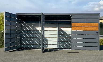 Odvětraný sklad na odpad, popelnice a kontejnery, materiály které potřebují větrání. Rozměr 5 x 1,3 m, 3 x dveře se zámkem FAB a klikou s možností přidělání klíčů, přední výška 2,26 m, na konci spádu 2,16 m.